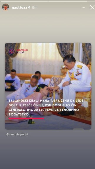 - Tajlandski kralj Maha Tjera tera ženu da jede gola iz speće činije, psu dodelio čin generala, ima 20 ljubavnica i enormno bogastvo - glasila je objava.