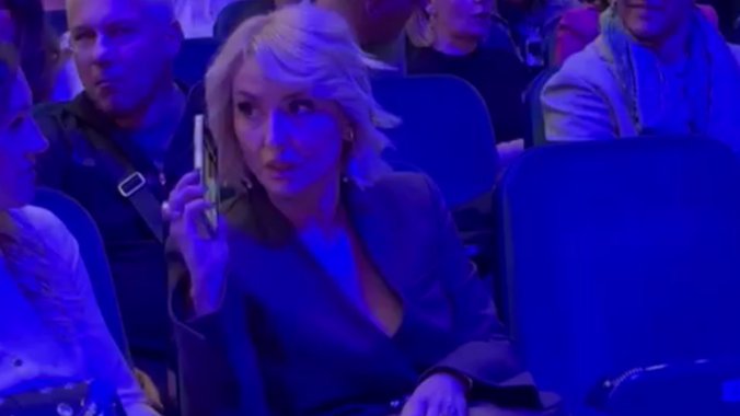 Svoje mesto zauzela je sama, a pitanje je da li je telefonirala sa suprugom Rašom Novakovićem, koji na koncert kasni, ili je bio sprečen da zajedno sa suprugom uživa u večerašnjem spektaklu.