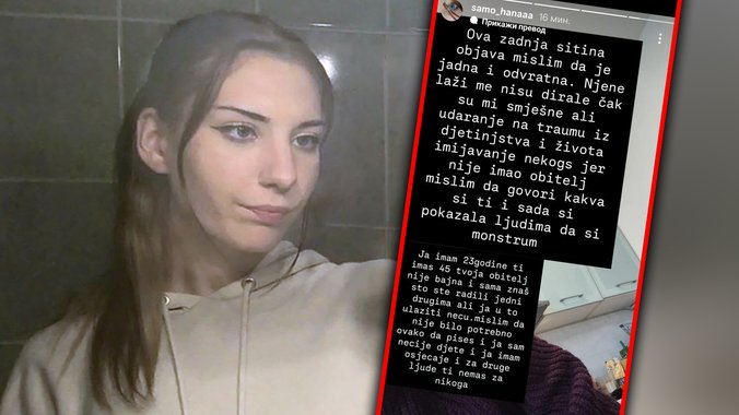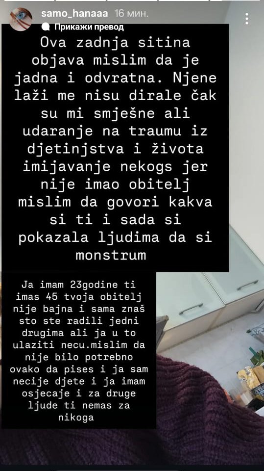 - Ja imam 23 godine, ti imaš 45 tvoja obitelj nije bajna i sama znaš što ste radili jedno drugima, ali ja u to ulaziti neću. Mislim da nije bilo potrebno ovako da pišeš, i ja sam nečije dete i ja imam osećaje i za druge ljude, ti nemaš ni za koga - poručila je Hana putem Instagram storija.