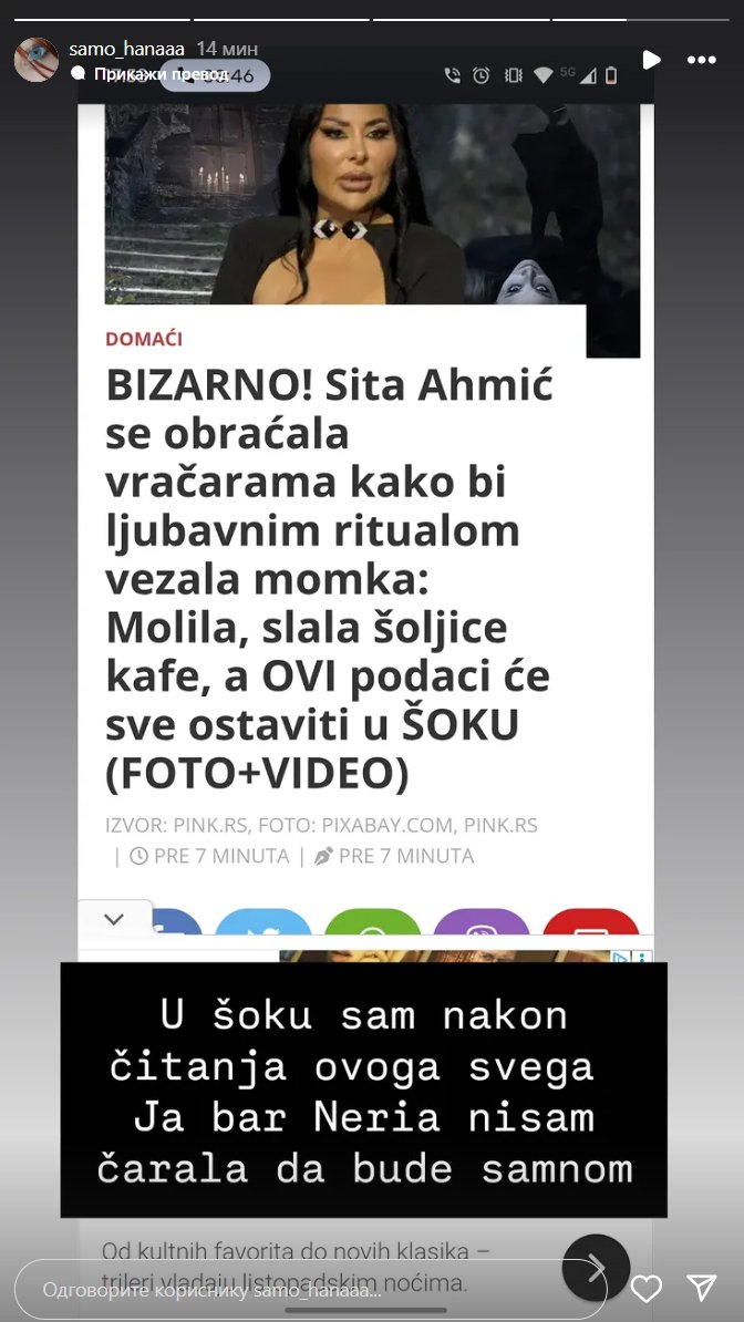 - U šoku sam nakon čitanja ovoga svega. Ja bar Neria nisam čarala da bude sa mnom - napisala je Hana.