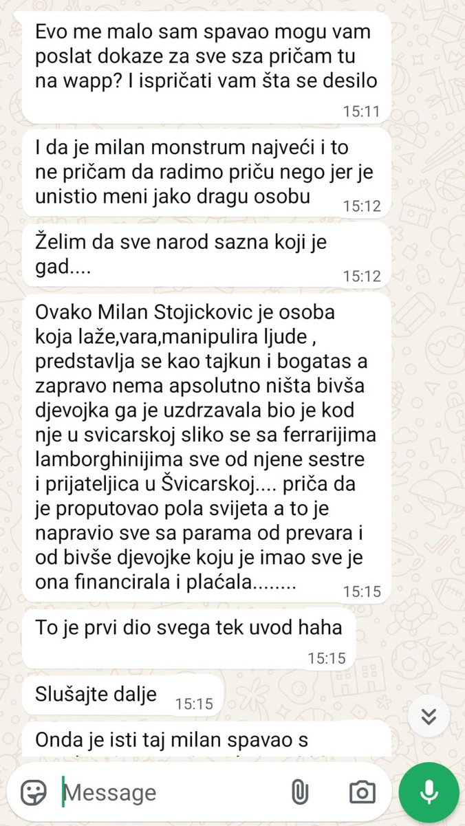 Takođe, izvor dodaje i da svi automobili koje je Milan vozio su bili od rođakinje njegove bivše devojke u Švajcarskoj, dok je pričao da su njegovi, a on nema ni 2 evra u džepu. Saznajemo i da nikad ništa nije radio osim par nedelja u pošti jer ga je bilo sramota da ga neko ne vidi, dok se predstavlja kao preduzetnik.