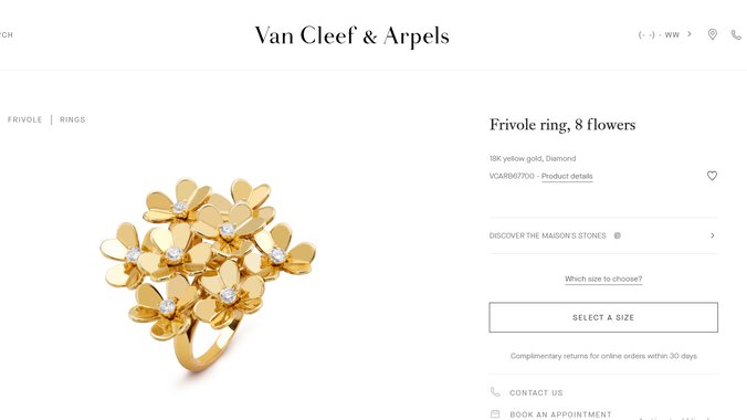 Naime, reč je o prstenu brenda Van Cleef & Arpels, koji je izrađen od osamnaestokaratnog žutog zlata, a na sebi ima čak osam dijamanata. Dijamanti su okruglog brusa i raspoređeni su u centru svake cvetne forme.