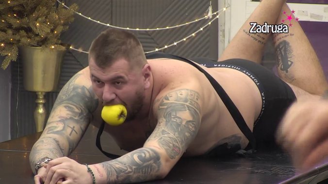 Sledeći zadatak koji je gubitnik morao da ispuni je da se skine u donji veš i da sa jabukom u ustima ,imitirajući prase, legne na sred crnog stola!