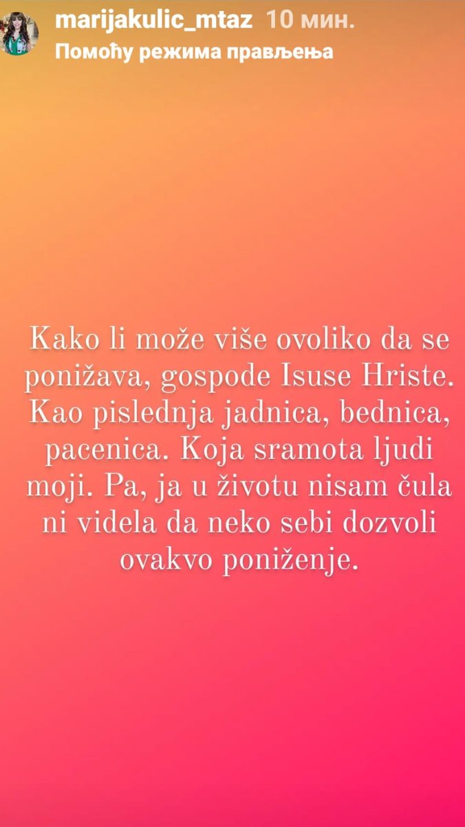 Kako li može više ovako da se ponižava, Gospode Isuse Hriste. Kao poslednja jadnica, bednica i paćenica. Koja sramota ljudi moji. Pa ja nikad u životu nisam videla da neko sebi dopusti ovoliko poniženje -napisala je Marija na storiju.