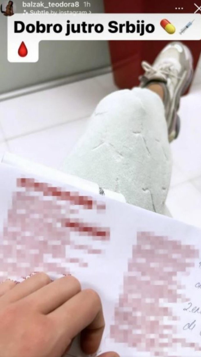 - Dobro jutro, Srbijo - napisala je Teodora na svom Instagram storiju, uz fotografiju iz čekaonice i uz to dodala emotikone šprica i tablete.