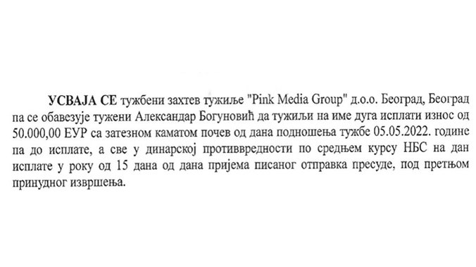 - Usvaja se tužbeni zahtev tužilje "Pink Media Group" D.O.O Beodrag, Beograd pa se obavezuje tuženi Aleksandra Bogunović da tužilji na ima duga isplati iznos od 50 000, 00 EUR sa zateznom kametom počev od dana podnošenja tužbe 05.05.2022. godine da do isplate, a sve u dinarskoj protivvrednosti po srednjem kursu NBS na dan isplate u roku od 15 dana od dana prijema pisanog otpravka presude, pod pretnjom prinudnog izvršenja - piše u presudi.