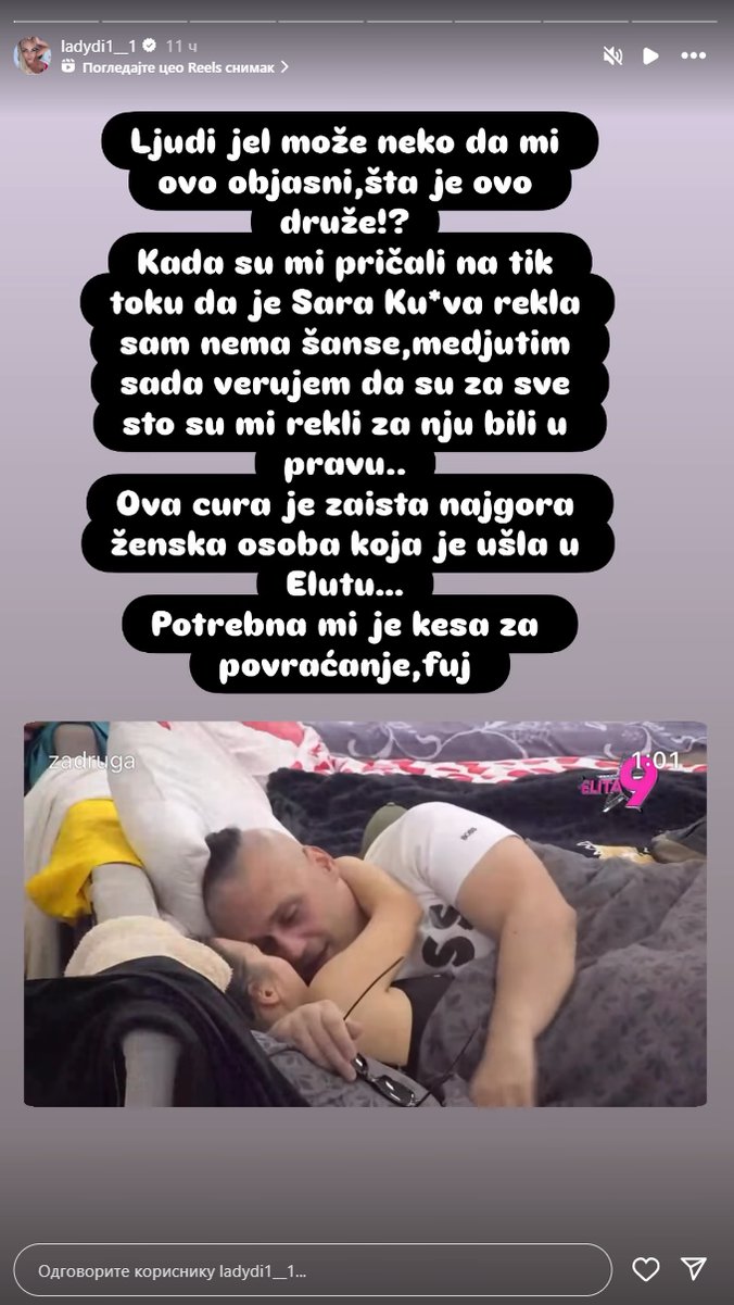 I bivša učesnica "Elite" Lejdi Di šokirana je Sarinim ponašanjem i njenim ljubavnim izborom, o čemu se javno izjasnila na storiju na Instagramu.