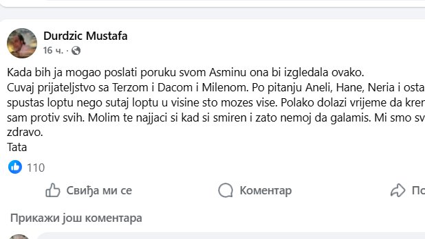 - Kada bih ja mogao poslazi poruku svom sinu Asmunu, ona bi ovako glasila ''Čuvaj prijateljstvo sa Terzom i Dačom i Milenom. Po pitanju Aneli, Hane, Neria i ostalih, nemoj da spustaš loptu, nego šutni loptu u visine, što više možeš. Polako dolazi vreme da kreneš sam protiv svih. Molim te, najjači si kad si smiren i zato nemoj da galamiš! Mi smo svi dobro. Tata - napisao je Asminov otac na svom statusu.