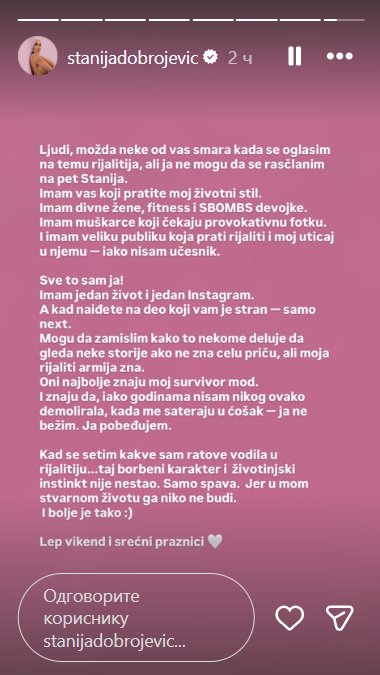 - Ljudi, možda neke od vas smara kada se oglasim na temu rijalitija, ali ja ne mogu da se raščlanim na pet Stanija. Imam vas koji pratite moj životni stil. Imam divne žene, fitnes devojke. Imam muškarce koji čekaju provokativnu fotku. I imam veliku publiku koja prati rijaliti i moj uticaj u njemu, iako nisam učesnik - napisala je Stanija i dodala: