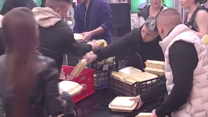 Naime, učesnici su odmah skočili do stola, pa su tako počeli da se otimaju oko kutija sa mesom.