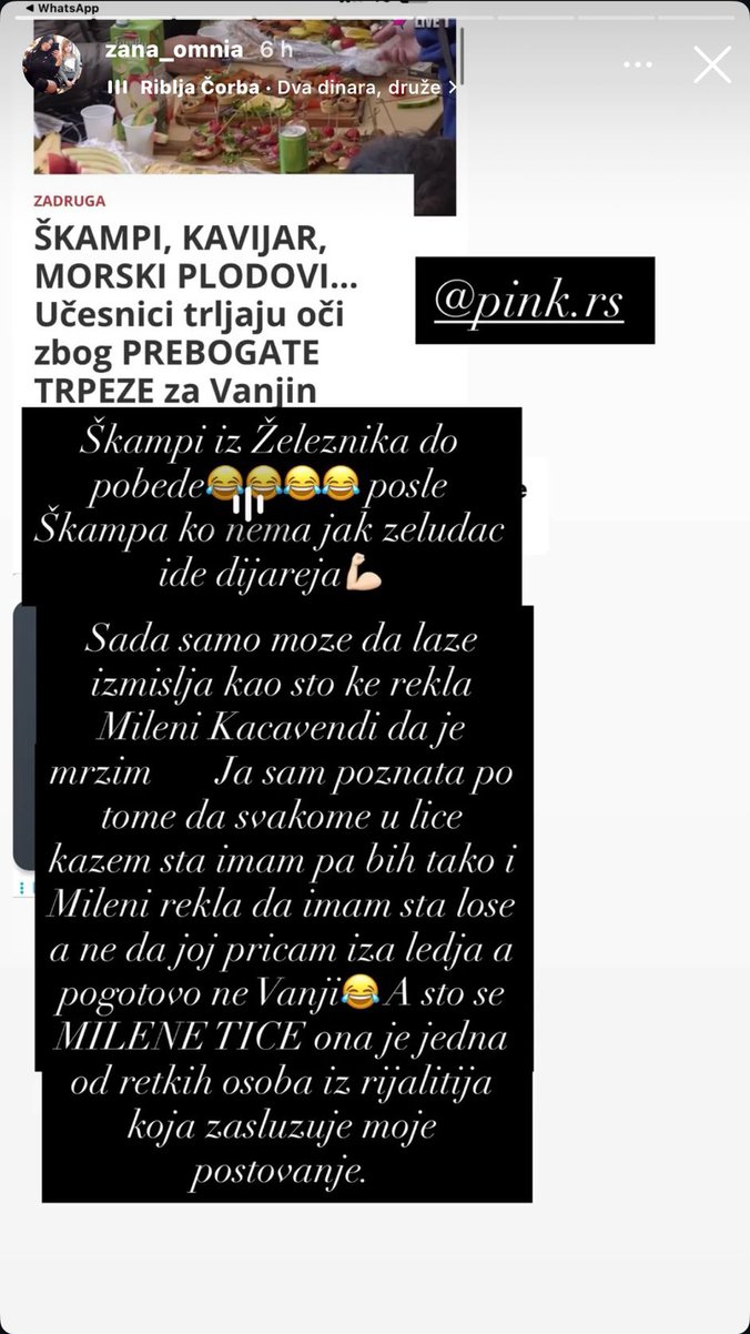 - Škampi iz Železnika do pobede (smeh). Posle škampa ko nema jak želudac, ide dij*reja. Sada samo može da laže, izmišlja, kao što je rekla Mileni Kačavendi da je mrzim. Ja sam poznata po tome da svakome u lice kažem šta imam, pa bih tako i Mileni rekla da imam šta loše, a ne da joj pričam iza leđa, a pogotovo ne Vanji. A što se Milene tiče, ona je jedna od retkih osoba iz rijalitija koja zaslužuje moje poštovanje - napisala je Žana Omnia na svom instagram profilu.