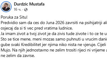 - Poruka za Situ! Predvideo sam da ćeš do juna 2026. završiti na psihijatriji, ali gledajući ovaj zadnji video imam osećaj da si ti već pred vratima ludnice. Ja imam život, a tvoj život je da živiš tuđe živote i to će te uništiti. Što se tiče mene, meni možeš samo puhnuti u vrućim danima, a tvoji doušnici koji su moji rođeci gube svaki kredibilitet, jer njima niko ništa ne veruje. Celi Štajr zna ko je Mustafa, ko je Izet i ko je Mujo. Na njih jednostavno ne želim trošiti reči ni vreme, a kad bih ipak trošio završili bi tamo gde ne želim da završe - napisao je Mustafa.
