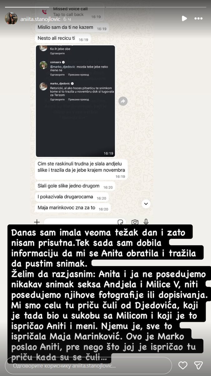 - Danas sam imala veoma težak dan i zato nisam prisutna. Tek sada sam dobila informaciju da mi se Anita obratila i tražila da pustim snimak. Želim da razjasnim: Anita i ja ne posedujemo nikakav snimak se*sa Anđelai Milice V, niti posedujemo njihove fotografije ili dopisivanja. Mi smo celu tu priču čuli od Đedovića, koji je tada bio u sukobu sa Milicom i koji je to ispričao Aniti i meni. Njemu je sve to ispričala Maja Marinković. Ovo je Marko poslao Aniti, pre nego što joj je ispričao tu priču kada su se čuli - napisala je Tamara na Anitinom Instagramu.