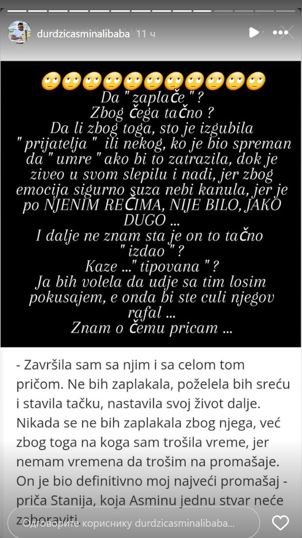 Povodom toga oglasili su se Asminovi fanovi koji mu sada vode Instagram profil i poslali bivšoj snajki brutalnu poruku.
