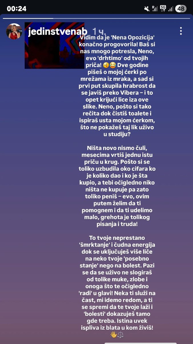 - Vidim da je "Nena Opozicija" konačno progovorila! Baš si nas mnogo potresla, Neno, evo 'drhtimo' od tvojih priča! Dve godine pišeš o mojoj ćerki po mrežama iz mraka, a sad si prvi put skupila hrabrost da se javiš preko Vibera – i to opet krijući lice iza ove slike. Neno, pošto si tako rečita dok čistiš toalete i ispiraš usta mojom ćerkom, što ne pokažeš taj lik uživo u studiju? - započela je Sofijina majka pa je dodala: