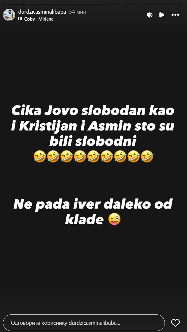 - Čika Jovo slobodan, kao Kristijan i Asmin što su bili slobodni. Ne pada iver daleko od klade - poručili su oni putem Asminovog zvaničnog Instagram profila.