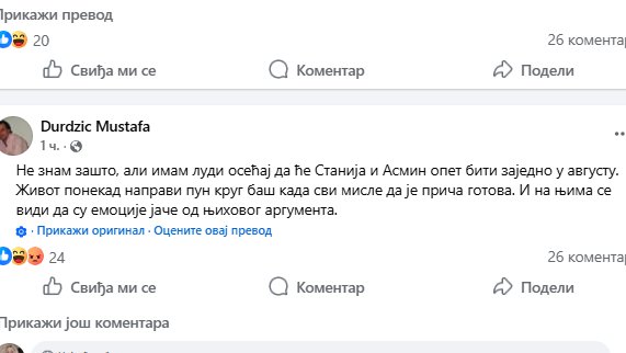 - Ne znam zašto, ali imam ludi osećaj da će Stanija i Asmin opet biti zajedno u avgustu. Život ponekad napravi pun krug, baš kada svi misle da je priča gotova. I na njima se vidi da su emocije jače od njihovih arhumenata - napisao je Mustafa.