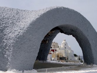 Santorini je ostatak vulkanskog ostrva na kome se zbila velika eksplozija negde u periodu 1650-1598. godine p. n. e. Serija zemljotresa je upozorila stanovništvo na kataklizmu koja se približava. O ovome se zna jer na ostrvu arheolozi nisu pronašli leševe iz tog vremena, niti vredne predmete. Erupcija vulkana je izazvala cunami visine 60 metara koji je uništio severnu obalu Krita, i veliki deo minojske flote. Na mestu nekadašnjeg ostrva stvorena je kaldera (ostatak vulkanskog grotla), a vulkanski pepeo je pokrio šire područje što je onemogućilo ljudski život za duže vreme. Veruje se da je erupcija Santorinija bila inspiracija Platonu za njegovu parabolu o Atlantidi. Veliki oblak vulkanske prašine se zatim premestio čak do Severne Amerike, gde su klimatske promene izazvale migracije stanovništva na jug.