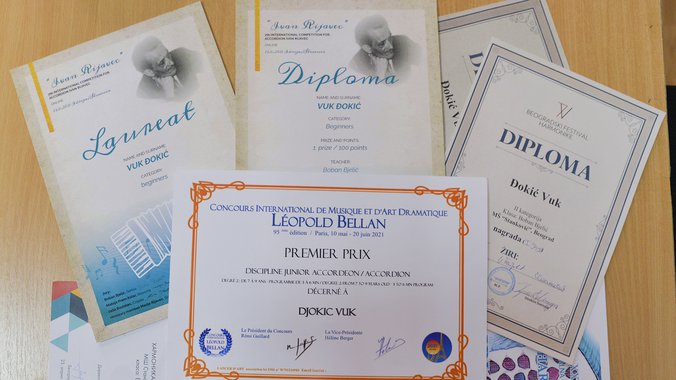 Vuk je učenik četvrtog razreda u dve škole, Osnovne škole "Vasa Pelagić" u Kotežu i Muzičke škole "Kornelije Stanković", koje pohađa sa najboljim ocenama. Osvojio je prva mesta i zlatne medalje na nedavnim takmičenjima, Beogradskom festivalu harmonike i Republičkom takmičenju, najvažnijem takmičenju u Srbiji, kao i prošle godine na Međunarodnom takmičenju u Ljubljani sa osvojenih 100 bodova i zvanjem laureata u svojoj kategoriji.