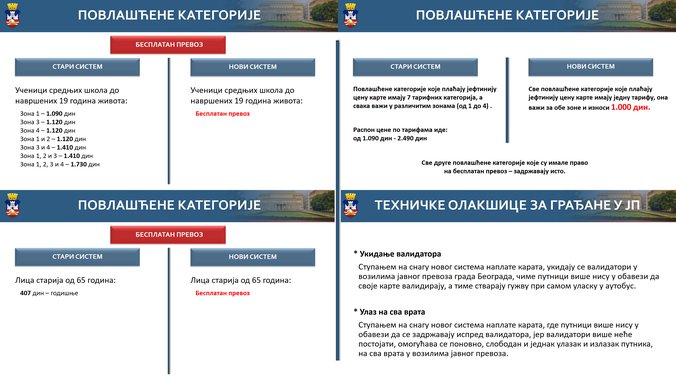 – Osim osnovaca, pravo na besplatan prevoz imaće i srednjoškolci, koji su do sada plaćali između 1.090 i 1.730 dinara. Sugrađani koji imaju više od 65 godina bili su u obavezi da jednom godišnje odu na prodajna mesta i da po ceni od 417 dinara dobiju godišnju kartu. Sada više neće imati tu obavezu već će im karta biti besplatna i doživotna – istakao je Šapić. Kada je reč o povlašćenim kategorijama, kojih je do sada bilo nekoliko desetina, imale su obavezu da plaćaju od 1.090 do 2.490 dinara. Sve kategorije su zadržane, samo je cena linearno smanjena i iznosiće samo hiljadu dinara, istakao je Šapić.