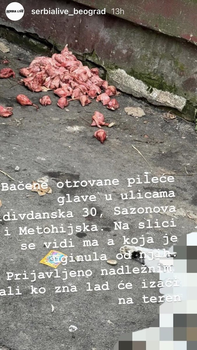 - Bačene otrovane pileće glave u ulicama Vidovdanska, Sazanova i Metohijska. Na slici se vidi mačka koja je uginula od njih. Prijavljeno je nadležnima, ali ko zna kad će izaći na teren - navodi se u poruci koja je objavljena na storiju Instagram stranice "Serbialive Beograd".