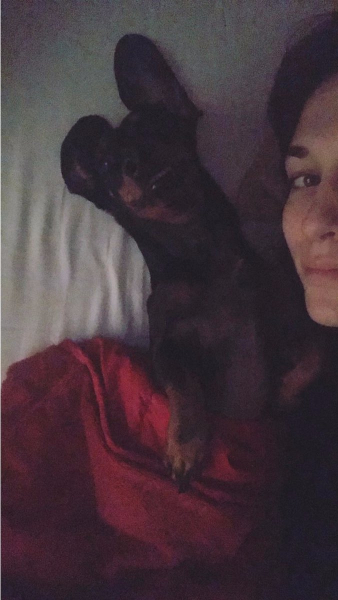 Ovog puta u njenom krevetu nije završio neko od pomenute dvojice već njen kućni ljubimac. Ona je otkrila na "Instagramu" da joj njen pas pravi društvo u postelji, a po njenom izrazu lice, rekli bismo, da je i posle ljubavnih brodoloma i te kako srećna.