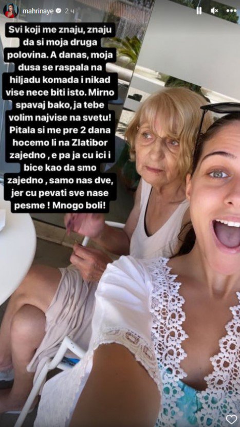 - Svi koji me znaju, znaju da si moja druga polovina. A danas, moja duša se raspala na hiljadu komada i nikad više neće biti isto. Mirno spavaj bako, ja tebe volim najviše na svetu! Pitala si me pre dva dana hoćemo li na Zlatibor zajedno, e pa ja ću ići i biće kao da smo zajedno, samo nas dve jer ću pevati sve naše pesme! Mnogo boli - napisala je pevačica u objavi na Instagramu.