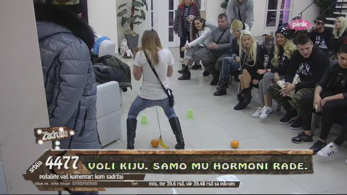 Kija i Enis su u igri koja im donosi duple glasove imali svoje voćke. Kanap na kome je vezana banana, bilo je potrebno staviti oko struka, a uz pomoć te banane trebali su da guraju pomorandže do svojih čaša.