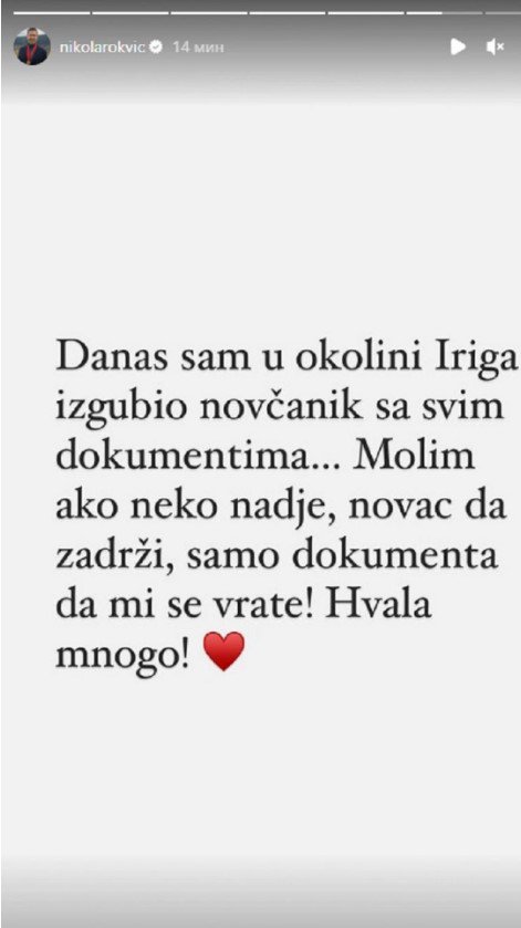 Danas sam u okolini Igira izgubio novčanik sa svim dokumentima... Molim ako neko nađe, novac da zadrži, samo dokumenta da mi se vrate! Hvala mnogo! - napisao je Rokvić i dodao emotikon srca.