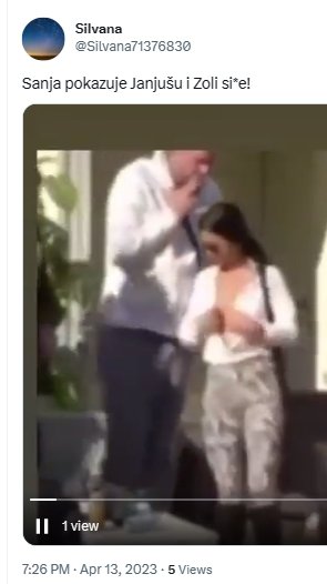 Iako je Sanja negirala sve, na Twitteru je isplivao snimak na kojem se jasno vidi kako Grujićeva pred punim dvorištem otkopčava belu košulju i pokazuje grudi Janjušu i Zoli koji nakon toga odlaze nasmejani.