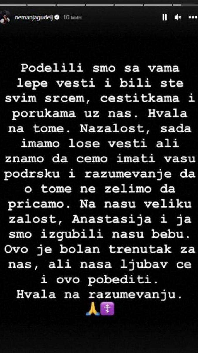 Anastasija Ražnatović je svoj profil na Instagramu ugasila, pa se potpuno povukla iz javnosti, želeći da težak period provede sa Nemanjom Gudeljem i uz podršku najbližih, a on se danas oglasio na društvenim mrežama i u više objava zahvalio obožavateljima na podršci posle saopštavanja tužne vesti.