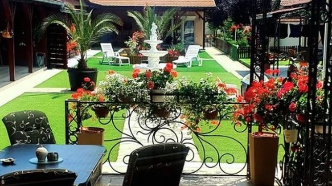 Dvorište je puno šarenog cveća, palmi, a poseban detalj je i fontana koja izgleda veoma skupoceno.