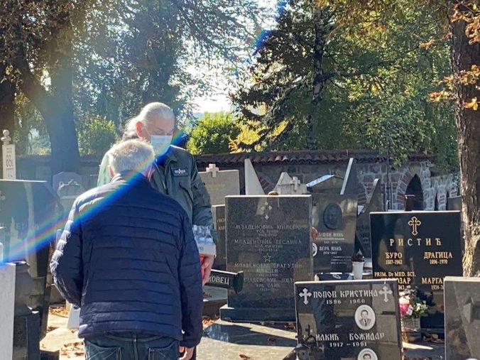 Tamo smo zatekli neutešnog Marininog supruga Aleksandra Futu Radulovića, koji je od tuge za njom i dva sina seo u blizini porodične grobnice, iznemogao od boli, pa su ga prijatelji i porodica tešili. On je nemo gledao u zemlju, a ono što je posebno izazvalo pažnju jeste i vrana, kao što možete videti na fotografijama, koja je sve vreme stajala iznad njegove glave.