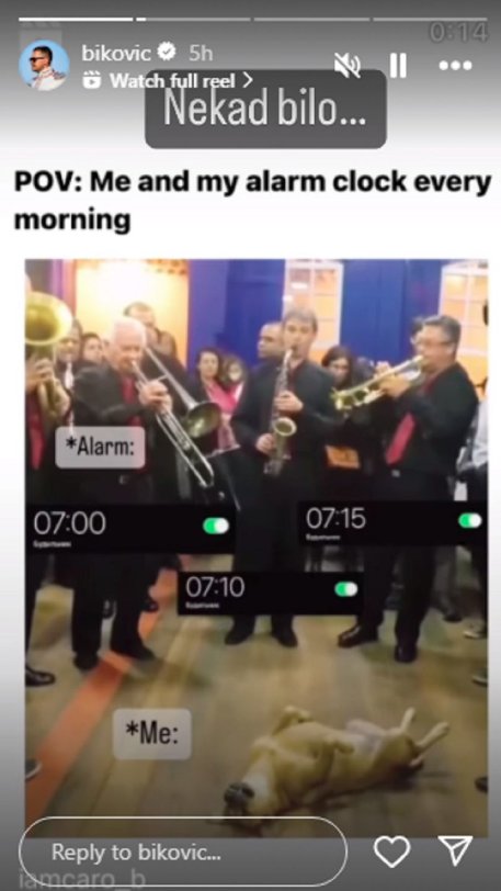 Pvo je postavio video na kome se vidi kako pas spava dok oko njega svira orkestar, uz opis: "Ja i moj alarm svakog jutra", u prevodu, kako ni nekoliko alarma nisu mogla da ga probude. Miloš je na to dodao opis: "Nekad bilo...".