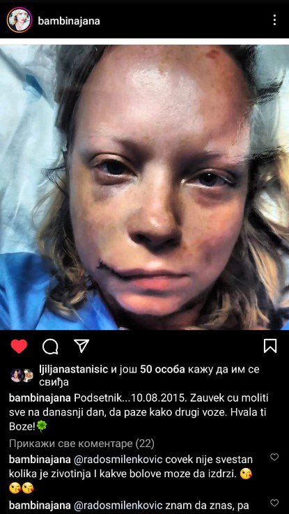 - 10. avgust 2015. godine, ponedeljak. Konačno sam skupila hrabrosti i snage da vam pokažem kako sam izgledala tog dana posle udesa, sa smrskanim kostima u glavi i nesvesna toga šta me čeka. Tada još nisam znala šta je sve smrskano i izvaljeno iz moje glave. Konačno sam skupila snage da ostavim ove teške godina i puno operacija iza sebe. Poenta ovog posta je da vam moja slika bude u glavi svaki dan kada izađete na ulicu i pazite kako drugi voze! - napisala je tad na društvenim mrežama.