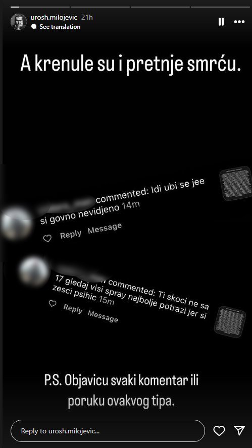 Milojević se danas ponovo oglasio putem društvenih mreža, pa obelodanio jezive pretnje koje dobija u porukama.
