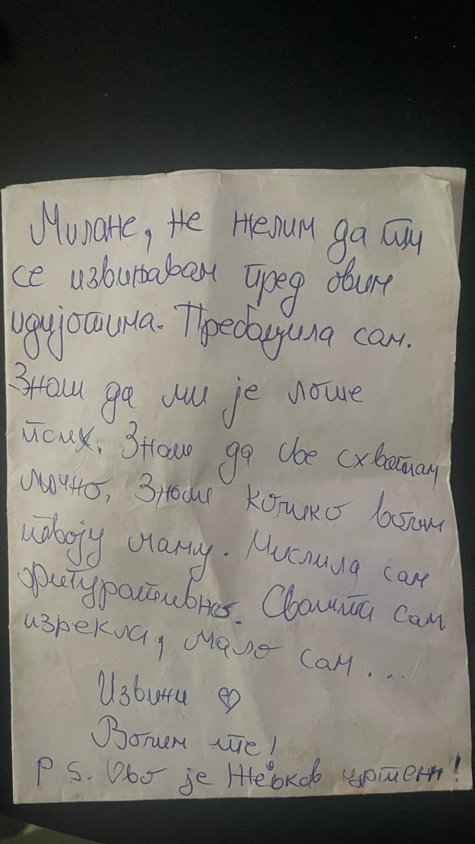 Milane, ne želim da ti se izvinim pred ovim idiotima. Prebacila sam. Znaš da mi je loše psiha. Znaš da sve shvatam lično, znaš koliko volim tvoju mamu. Mislila sam figurativno. Svašta sam izrekla, malo sam... Izvini...Volim te. Ps. ovo je Željkov crtež -napisala je Miljana.