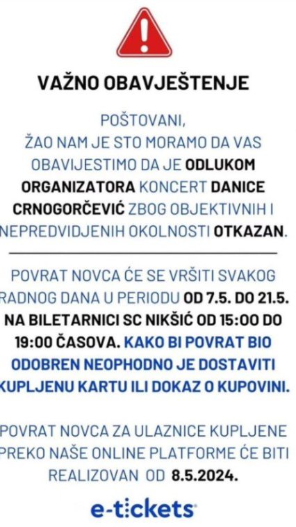 Odlukom organizatora koncert Danice Crnogorčević je otkazan zbog “nepredviđenih i objektivnih okolnosti”, kako se navodi u saopšenju na sajtu SC, gde je koncert trebao da se održi.