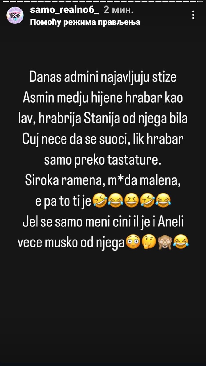 Danas admini najavljuju ''Stiže Asmin, hrabar kao lav''. Hrabrija Stanija od njega. Čuj, neće da se suoči, lik hrabar samo preko tastature. Široka ramena, mu*a malena. Je l' se samo meni čini ili je i Aneli veće muško od njega?! - samo je jedan od brojnih komenenstara na njegov račun.