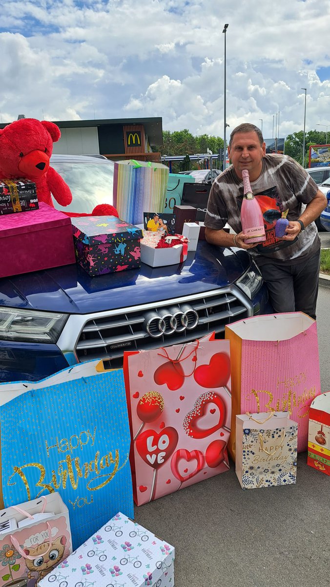 On je pozirao pored automobila, sa poklonima za svoju mesimicu.