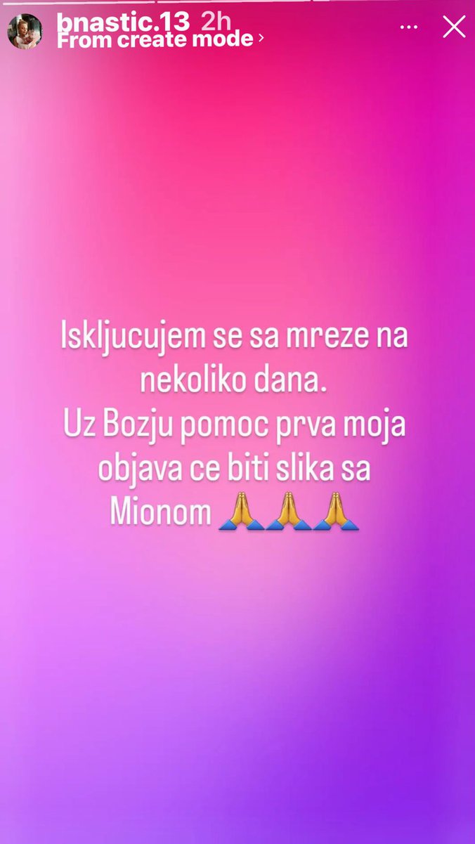 - Isključujem se sa mreže na nekoliko dana. Uz Božju pomoć prva moja objava će biti slika sa Mionom - napisala je Mionina majka na Instagramu.
