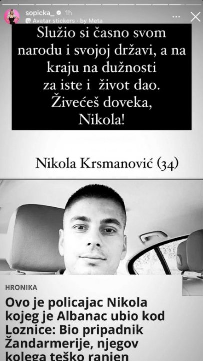 - Služio si časno svom narodu i svojoj državi, a na kraju na dužnosti za iste i život dao. Živećeš doveka, Nikola - napisala je Ivana Šopić na Instagram profilu.