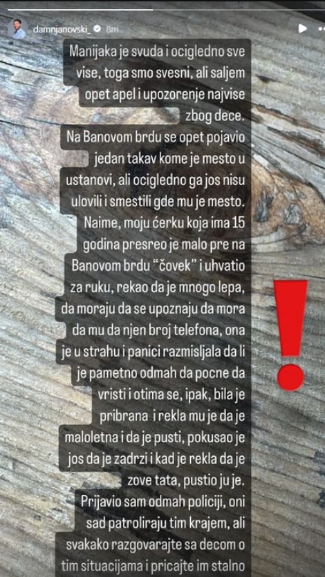 - Naime, moju ćerku koja ima 15 godina presreo je malopre na Banovom brdu "čovek" i uhvatio je za ruku. Rekao joj je da je mnogo lepa da moraju da se upoznaju, da mora da mu da njen broj telefona. Ona je u panici razmišljala da li je pametno da odmah počne da vrišti i otima se, ipak, bila je pribrana i rekla mu je da je maloletna i da je pusti. Pokušao je još da je zadrži i kada je rekla da je zove tata, pustio ju je. Prijavio sam odmah policiji, oni sad patroliraju tim krajem, ali svakako razgovarajte sa decom o tim situaciji i pričajte im da stalno svuda idu u grupi.