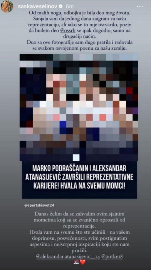 - Duo sa ove fotografije sam dugo pratila i radovala se svakom osvojenom poenu za našu zemlju. Danas želim da se zahvalim ovim sjajnim momcima koji su se zvanično oprostili od reprezentacije. Hvala vam na svemu što ste učinili - na vašem doprinosu, posvećenosti, svim postignutim uspesima i neiscrpnoj inspiraciji koju ste nam pružili - napisala je u objavi Saška Đoković Veselinov.