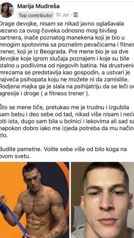 - Pre mene je bio sa dve devojke, koje igrom slučaja poznajem i koje su bile stalno u podlivima od njegovih batina. Na društvenim mrežama se predstavlja kao gospodin, a ustvari je najveća psihopata, koju ne možete ni da zamislite. Rođena majka ga je slala na psihijatriju da se leči od agresije i droge (a fitnes trener).