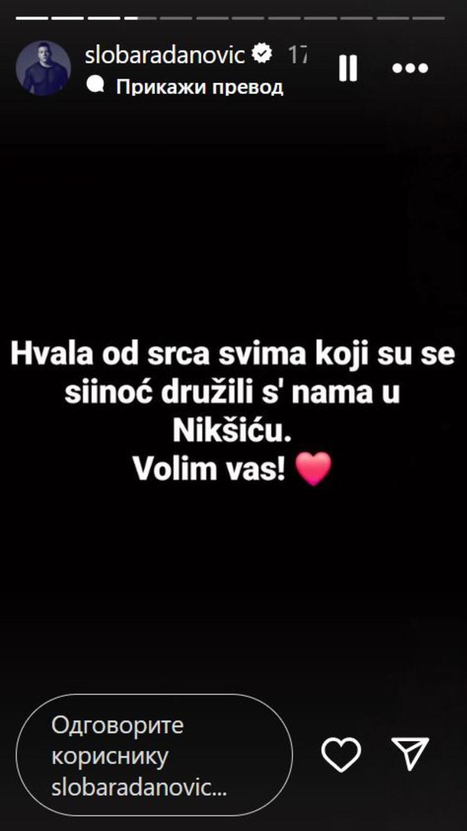 - Hvala od srca svima koji su se sinoć s nama družili u Nikšiću! Volim vas - bio je jasan pevač.