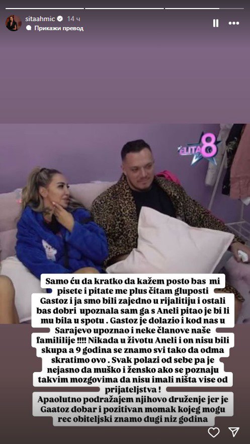 Nakon što svi komentarišu bliskost Aneli Ahmića i Nenada Marinkovića Gastoza, i njihovo druženje za se oglasila Sita Ahmić koja je otkrila kako gleda na njihovo druženje, te je svima stavila do znanja da one gastoza gledaju kao člana porodice.