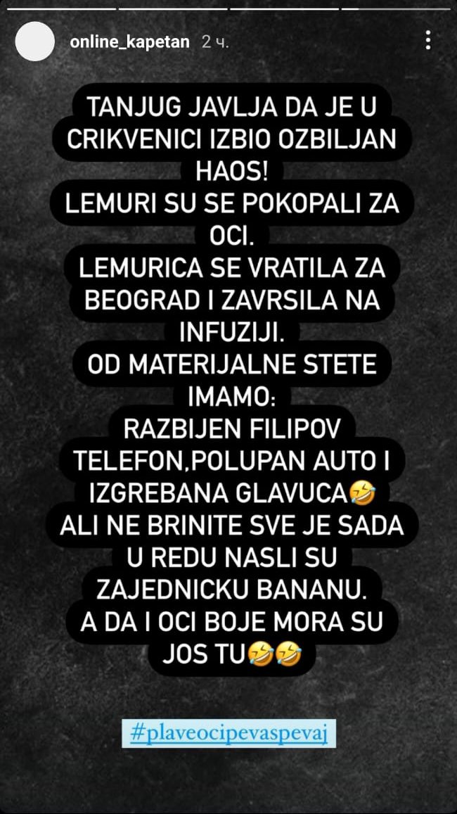 - Tanjug javlja da je u Crikvenici izbio ozbiljan haos! Lemuri su se pokopali za oči. Lemurica se vratila za Beograd i završila na infuziji. Od materijalne štete imamo: Razbijen Filipov telefonm polupan auto, izgrebana glavudža! Ali ne brinite, sve je sada u redu, našli su zajedničku bananu, a da oči boje mora su još tu - glasila je poruka na Instagramu.