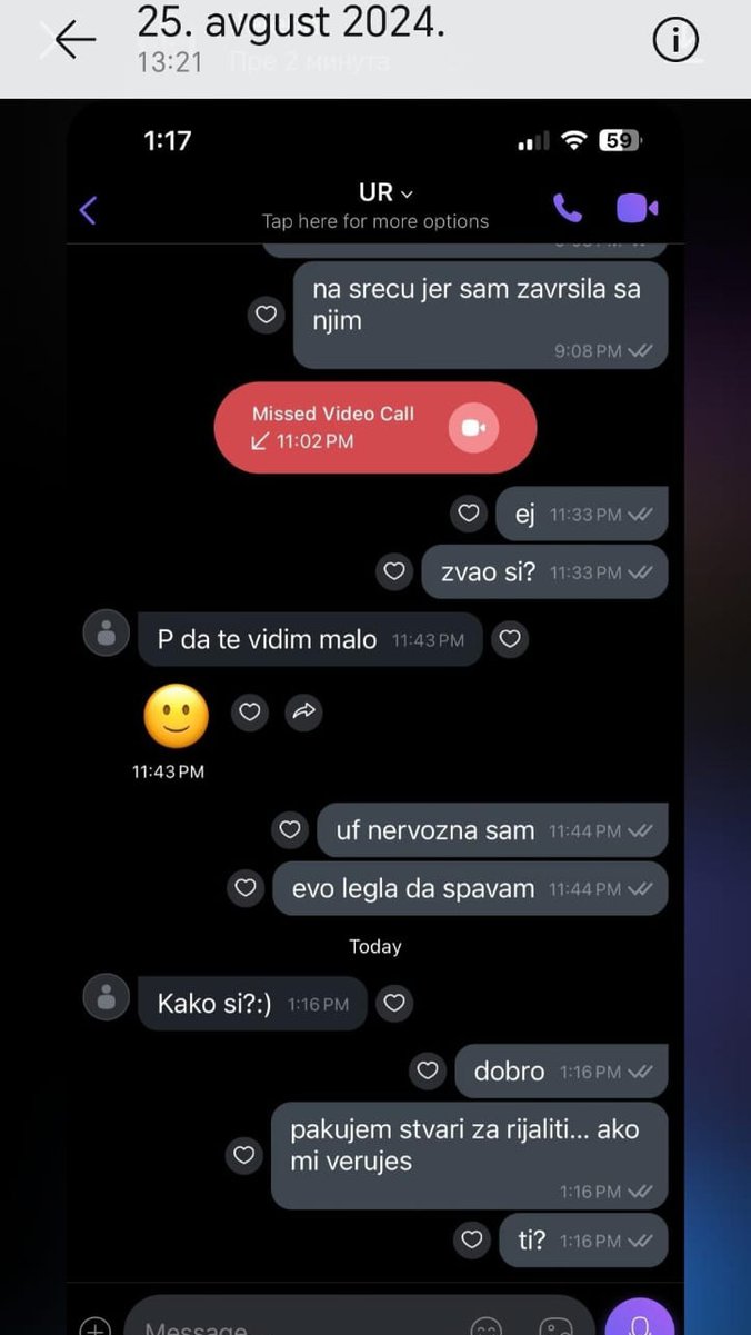 Naš portal je došao u posed prepiske Jelene i Uroša koja se odvila 25. avgusta, u kojoj se jasno vidi da on potencira na komunikaciji, kao i da joj je tražio da se vide preko video poziva.
