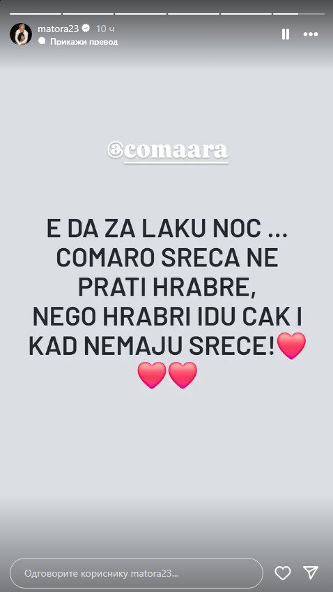 - Comaro sreća ne prati hrabre, nego hrabri idu čak i kad nemaju sreće - napisala je Matora.